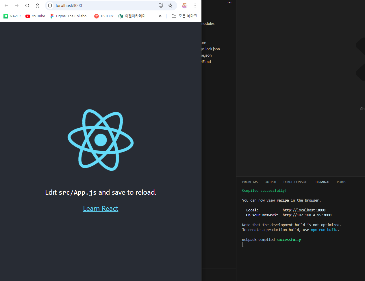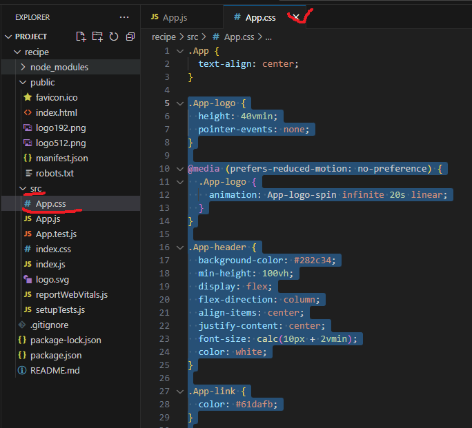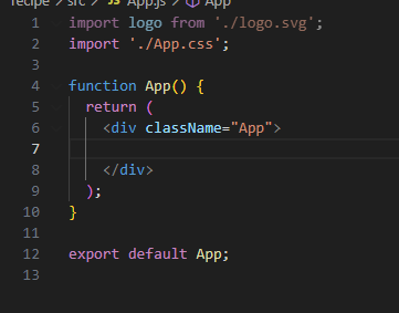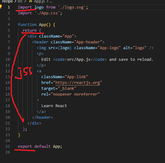 import 로 불러오고 export로 닫아준다. return 안에는 html형식을 넣어주는데 이때 안에 넣어주는 언어를 jss 라고 한다. 여기서 주의할 점은 단일태그를 기존 html에서는 닫지 않아도 되었지만 여기서는 닫는 태그를 넣어 </> 주어야 닫힌다.