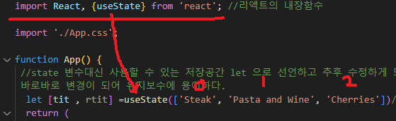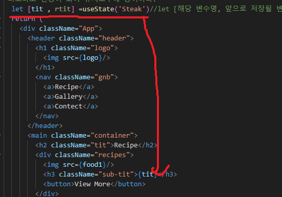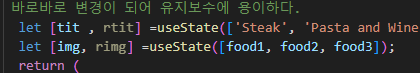 데이터 바인딩으로 데이터를 선언하고 {} 로 jss 언어의 리액트 언어를 사용해서 해당 내용을 넣을수 있는 자바를 실행한다.